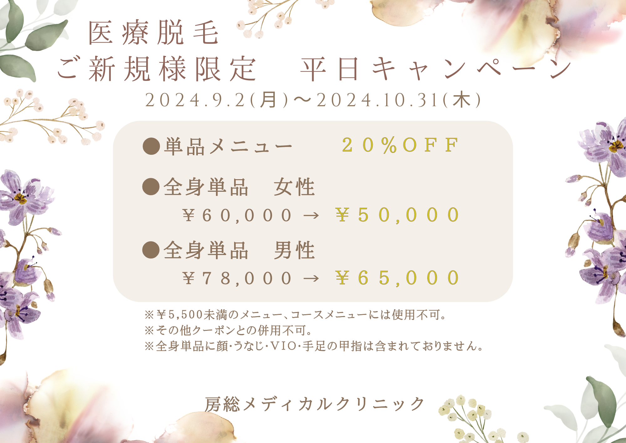 【皮膚科】ご新規様限定、医療脱毛平日キャンペーン実施中