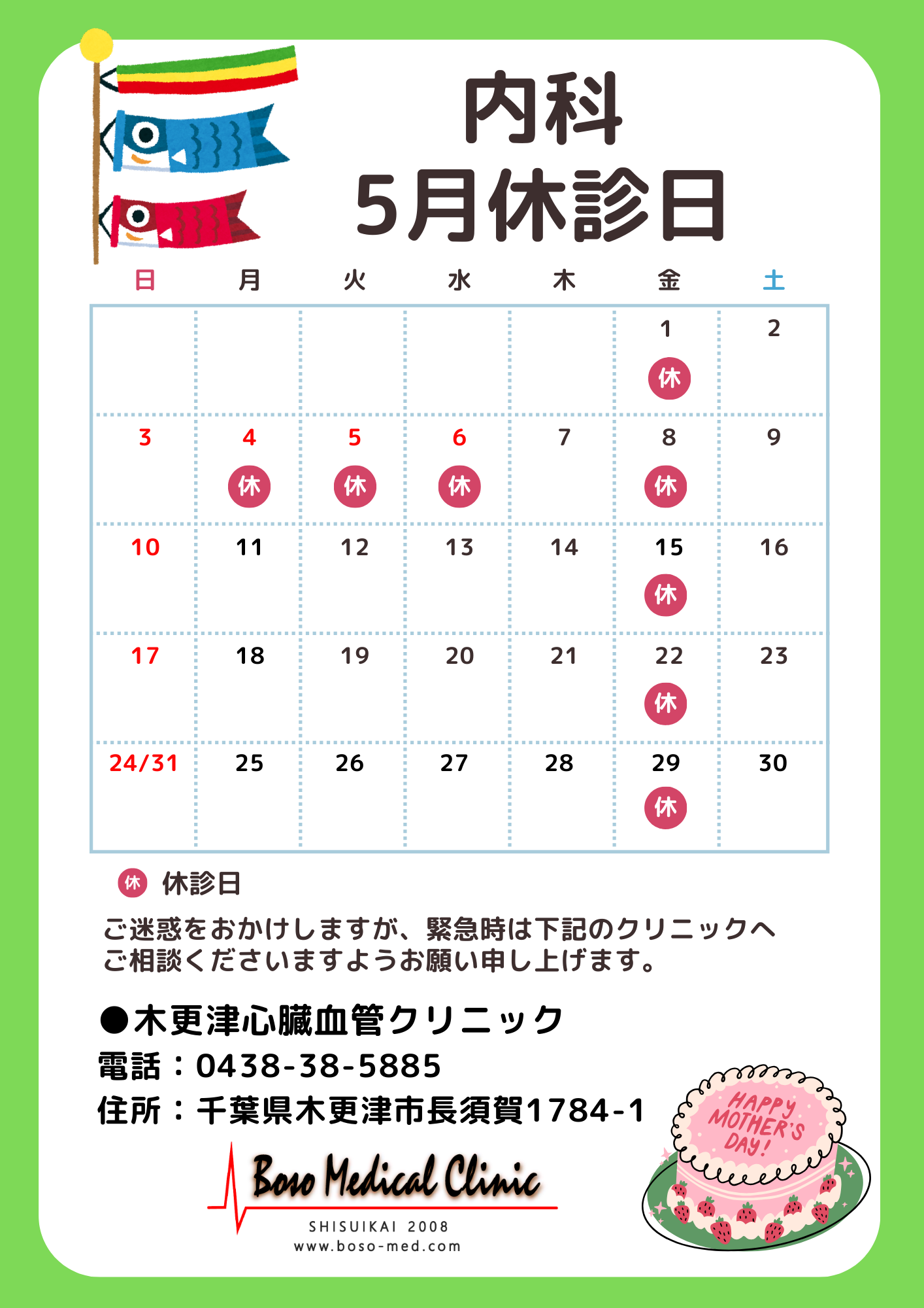 【内科】令和8年5月 休診日のお知らせ